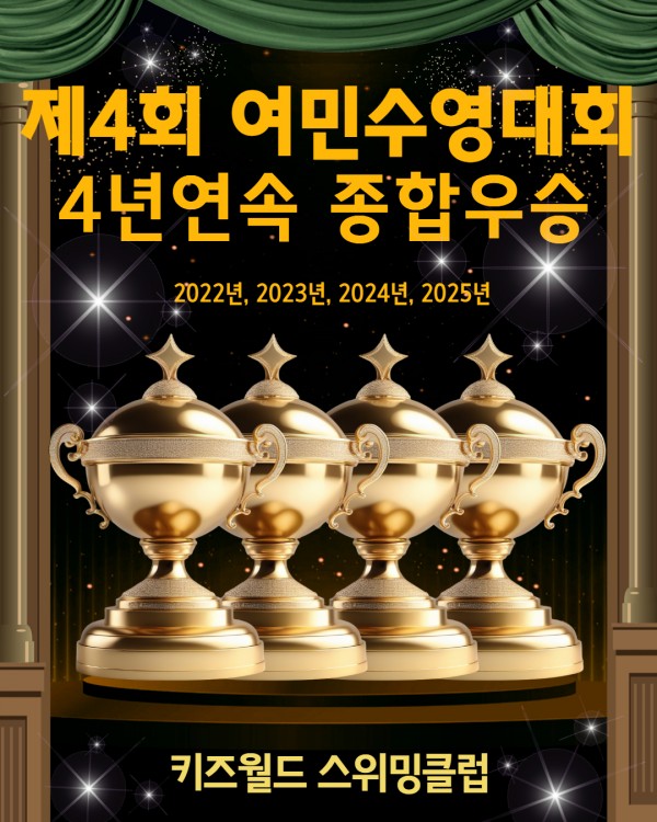 25.12.14(일) 정부세종청사수영장에서 개최한 제4회 여민수영대회에서 키즈월드 스위밍클럽 소속 선수들이 압도적인 실력으로 4년연속 종합우승을 차지했습니다. 대회에서 우수한 성적을 거둔 선수들, 함께 응원해주신 부모님, 지도선생님, 등 모든 분들 수고하셨습니다.